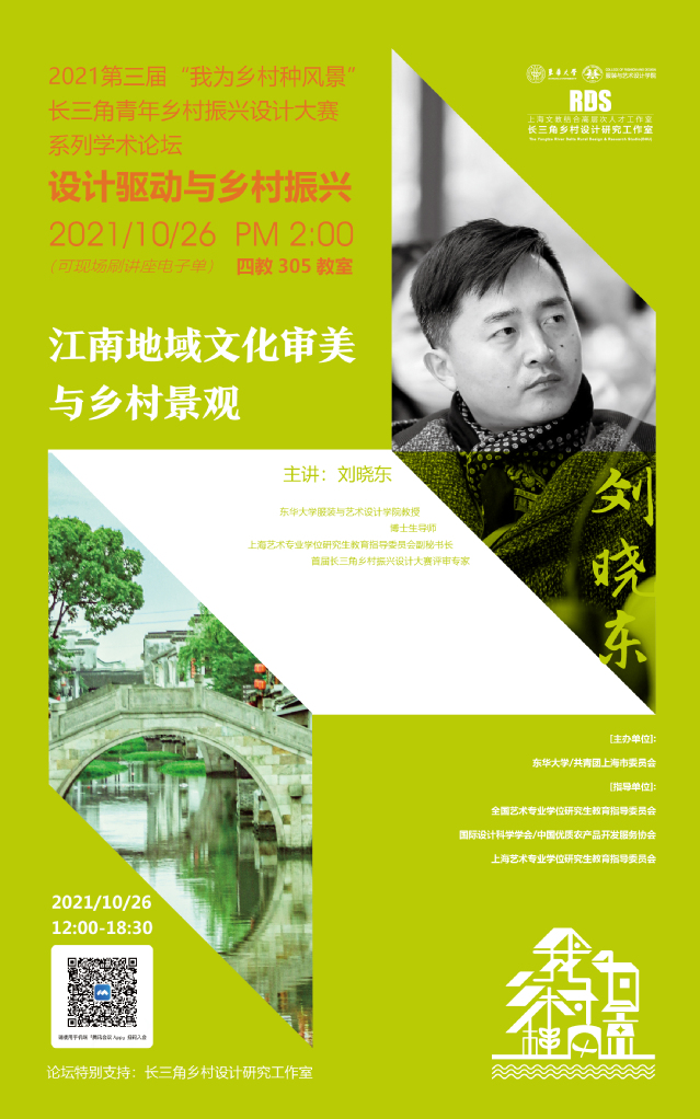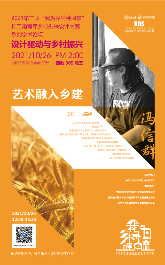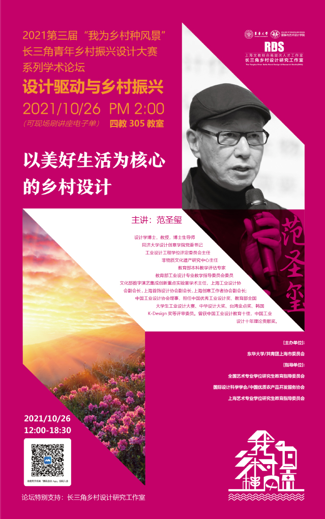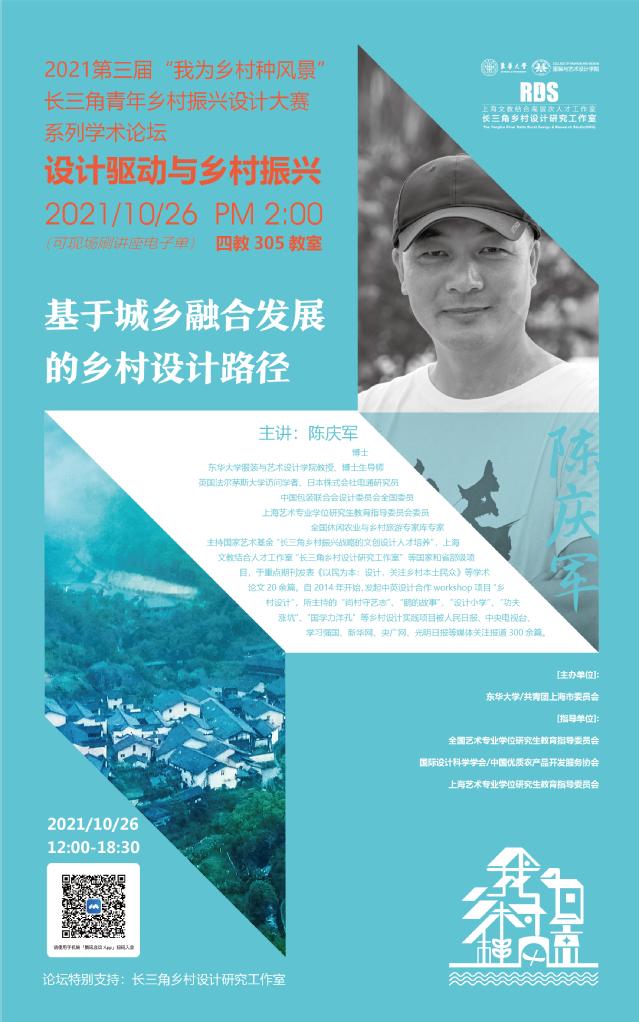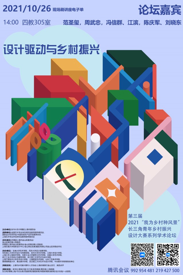 本次大赛由国际设计科学学会、中国优质农产品开发服务协会、全国艺术专业学位研究生教育指导委员会、上海艺术专业学位研究生教育指导委员会、上海市供销合作总社,以及共青团上海市委员会、上海市农业农村委、妖精视频 、金山区乡村振兴工作领导小组共同发起。大赛分为竞赛、论坛、展览和成果出版等四个环节。本次“我为乡村种风景”主题系列讲座作为长三角青年乡村振兴设计大赛有机组成部分,将从美丽乡村建设学术理论研究层面进行探索。讲座将由同济大学范圣玺教授、上海交通大学周武忠教授、妖精视频 冯信群教授、上海师范大学美术学院江滨教授、妖精视频 陈庆军教授、妖精视频 刘晓东教授从六个视角共同展开宣讲。
