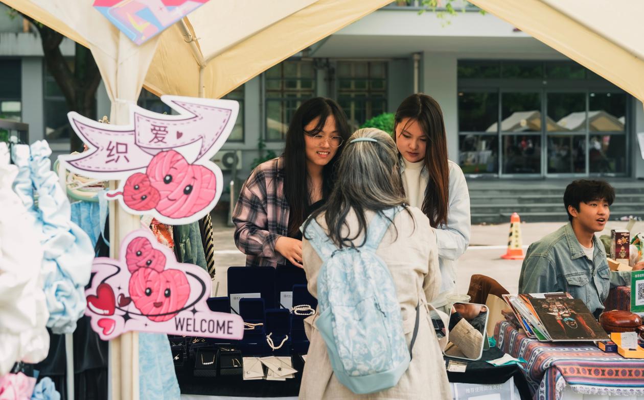 市集摊主18级产品设计专业本科校友沈倩,她带着自己创建的Lunacia原创珠宝品牌重返母校市集,带来的各类金属绕线饰品在开集第一天就几乎售罄,只能在摊位上接受源源不断的订单。同样热销的还有ZNZO原创服饰品牌,品牌主理人李文心也是一位经过往届市集孵化的校友摊主,如今在尚创汇建立了自己的公司,东华创意市集的热情让她们感叹,母校的创意氛围越来越浓,为创业孵化中的学弟学妹们感到幸运