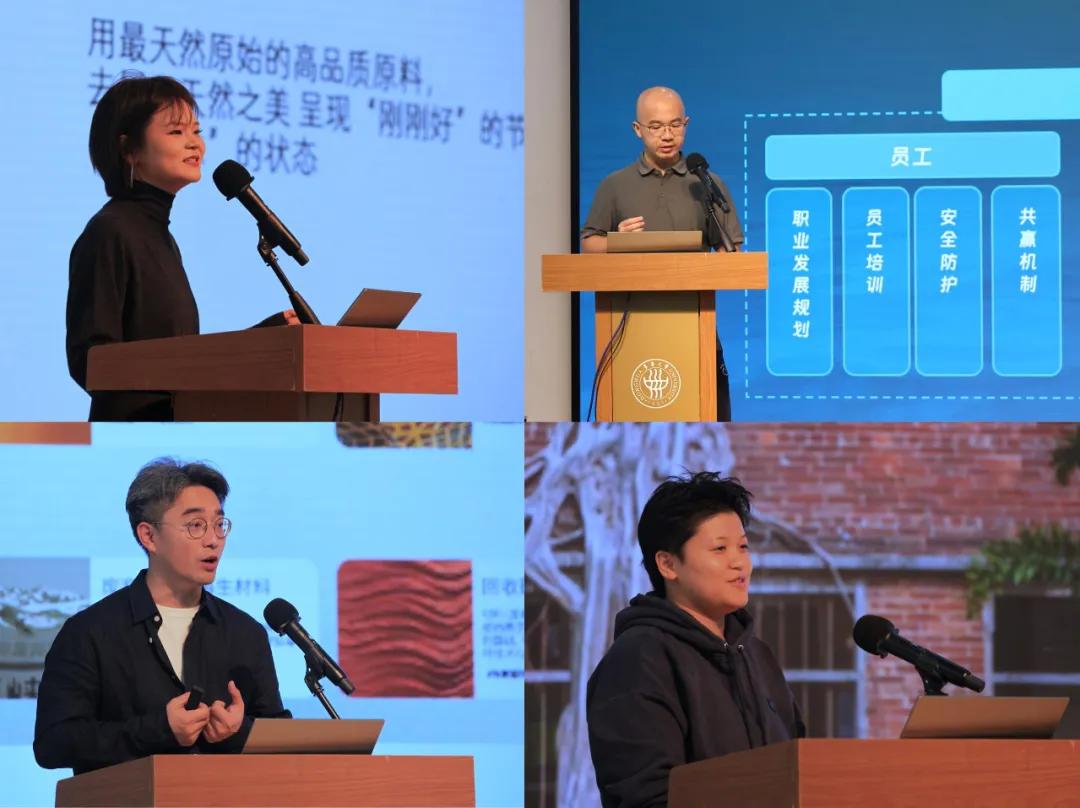 七位企业嘉宾进行了精彩演讲交流。上海羊织道服装有限公司CEO钱好好从原料、场景、营销等方面分享了如何在品牌建设中注入可持续发展的理念,引领我们走向一个更加绿色的未来;伟星股份可持续发展部经理李富龙介绍了海洋回收材料、化学回收材料、生物基材料等,以及怎样通过资源循环进行长期可持续发展;比音勒芬服饰股份有限公司空间陈列部总监马域人先生讲述利用可持续设计材料对原有的建筑结构进行艺术化再处理的方法,达到融入城市、跳脱界限的效果;木月建筑设计事务所创始人及主持建筑师毛颖女士将建筑视为一种文化表述与社会参与的重要力量,并且向当代建筑语言化发展,构建人与自然共生的有机生命体来达成环境可持续发展。