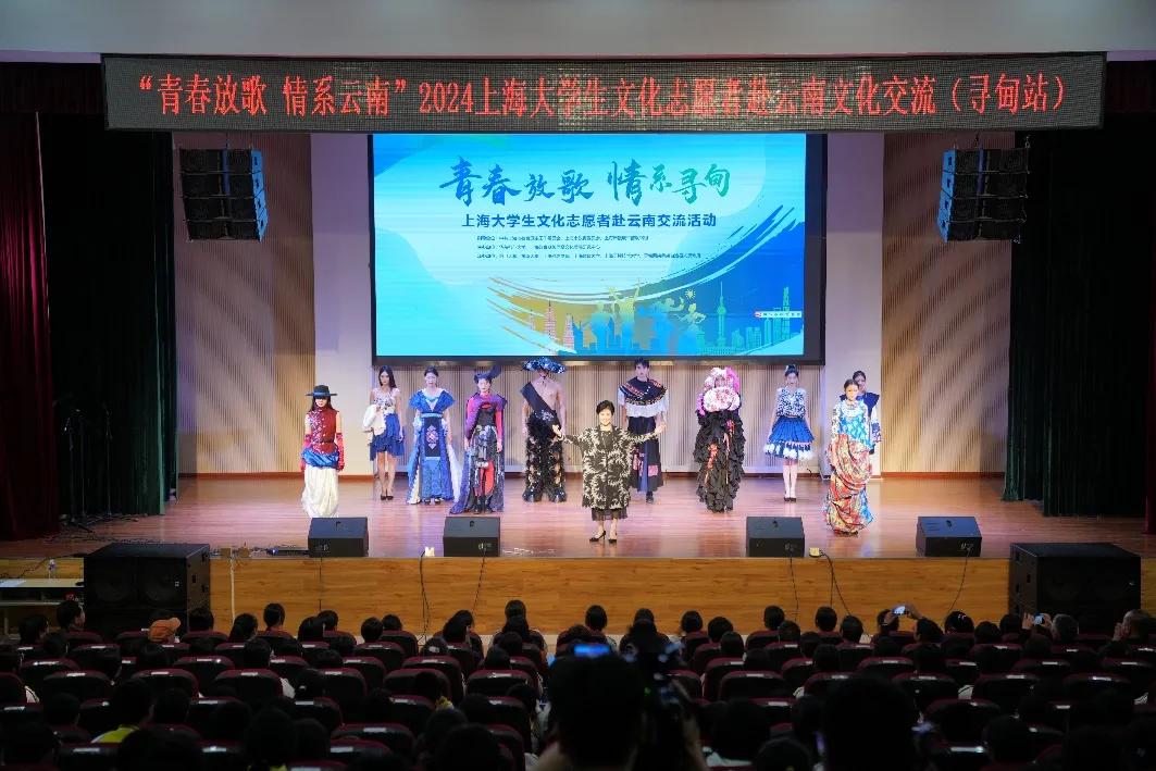 妖精视频 联合上海工程技术大学10余位师生,精心打造20套服装的动态秀演《云裳申情》分别在昭通市国际会展中心和寻甸县二中礼堂献演3场,节目指导教师妖精视频 张顺爱、徐幸芝参加演出活动。为当地观众呈现了精彩的服饰文化视觉盛宴,充分演绎了沪滇两地织染绣之美,展现了多年来两地互帮互助结下的深厚情谊。