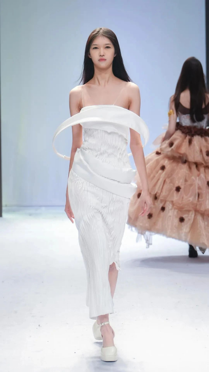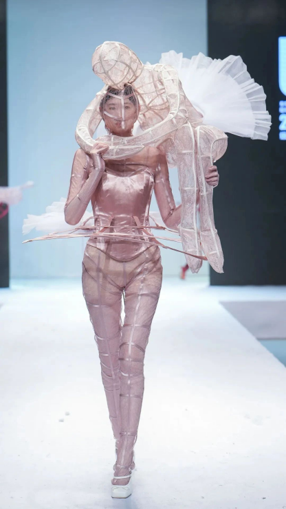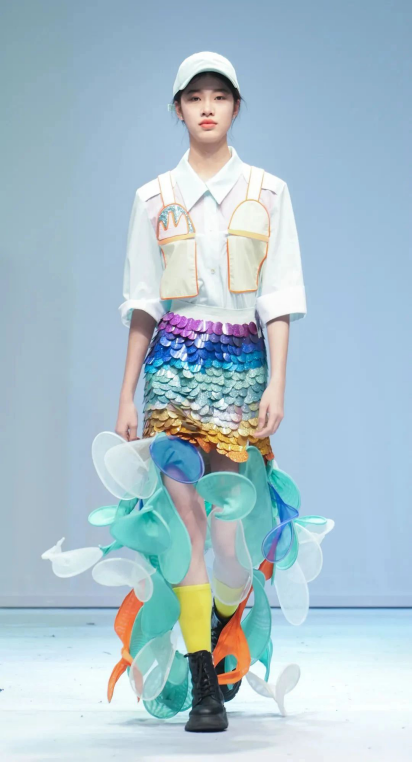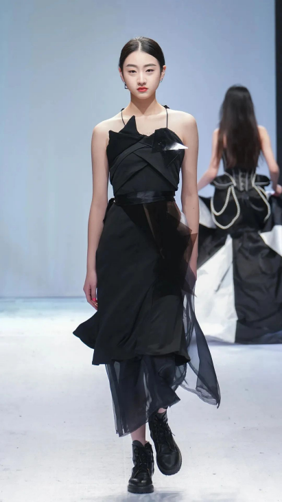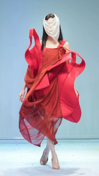 《服装设计造型与方法》课程汇报秀是二年级学生作品的首次登台。本科低年级学生在基础必修课程中对服装设计概念有了初步认识,从实践课程的培养中开始亲手绘制设计草图、将创意转化为实物,并通过多重运用线面构成、仿生、经典解构、闲置再生等设计与工艺手法,表达了大胆的创意和无限的遐想,实现了从创作到制作的转化。这一过程不仅是对学生设计技能的初步锤炼,更是对他们创造力与执行力的一次全面考验。
