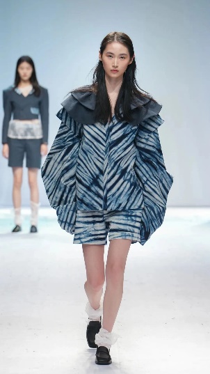 服装与服饰设计专业研究生学位作品展示呈现出更加注重于材料创新、工艺创新的特点,利用新型材料开发出具有特殊功能的服饰,如采用无缝针织技术及科技功能性面料的运动功能性服装;采用可降解生物塑料、回收材料再设计、环保服装加工工艺等开展可持续时尚的研究;或是对特殊工艺,如创意性褶皱工艺、特色面料再造工艺、创意染色工艺等开展实验制作成品。这些作品展现了工艺材料发展与时尚产业发展的互促互进,实现了研究生思维宽度和站位高度新增量。