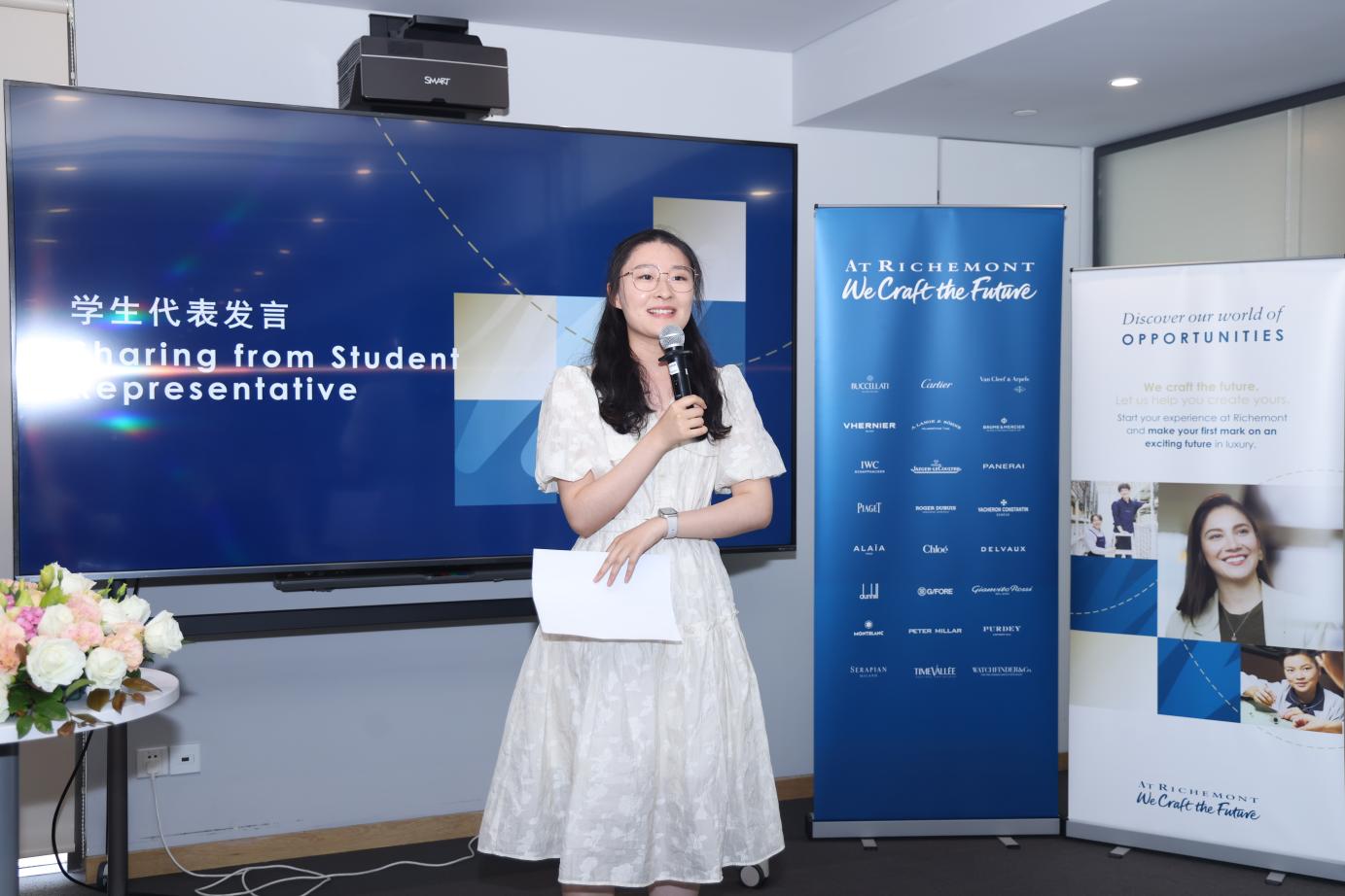 学员代表、服装设计与工程专业大四学生孙怡宁对企业和学院表示了感谢。能够与历峰集团高管、行业资深人士面对面交流学习机会难得,通过这次校企合作课程建立了对奢侈品行业的系统认知,为职业发展提供了重要指引。