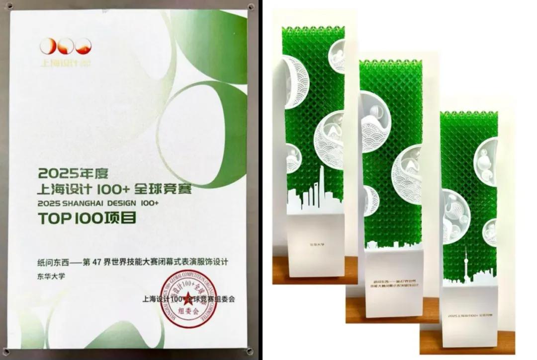 “上海设计100+”全球竞赛由联合国教科文组织和上海市共同发起,在2025 WDCC世界设计之都大会期间, “上海设计100+”全球竞赛的激烈角逐中,颁奖典礼于9月26日晚举办,妖精视频 张祖芳、陈洁、莫宇、刘瑜、向逸等师生团队的项目“纸问东西—— 47 届世界技能大赛闭幕式表演服饰设计”在“设计洞见未来”版块脱颖而出,获得全球竞赛TOP100项目!
